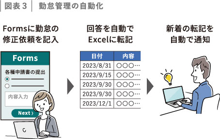 あらかじめFormsに必要事項を入力するための項目を設定することで、氏名や社員番号、問い合わせ内容などを抜け漏れなく取得することができます。回答はPower Automateを利用してExcelに転記され、問合せが追加された旨が担当者に通知されます。